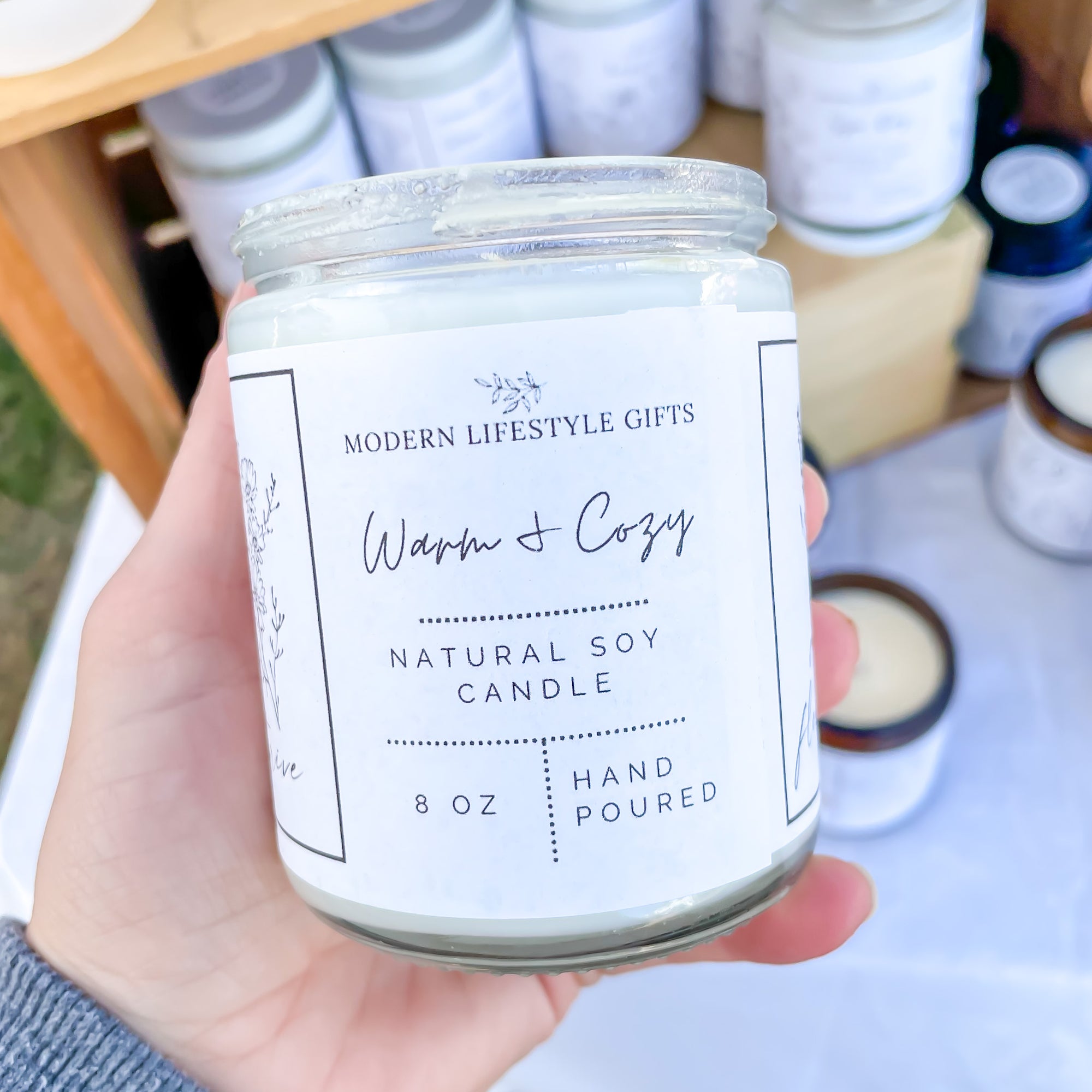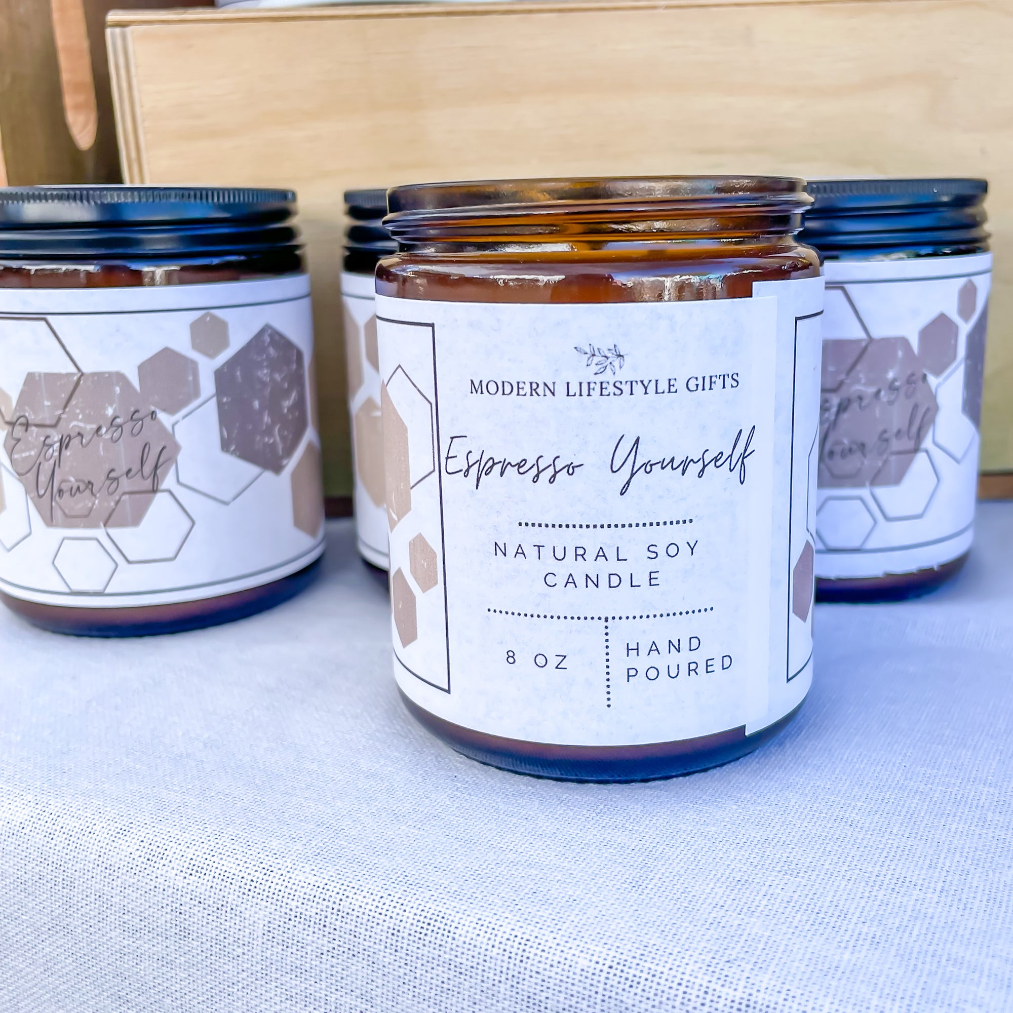 Feel the perfect harmony of smells, tranquility, and hominess with our Limited Edition Natural Hand Poured 8oz Soy Candles! Choose from 4 unique fragrances - Warm & Cozy, Vanilla Latte, Espresso Yourself, and Spa Day - to craft the ideal mood for you. Instantly switch any area into a peaceful retreat using the cozy vibes of our magnificent candles. Unique labeled jars you won't find anywhere else!