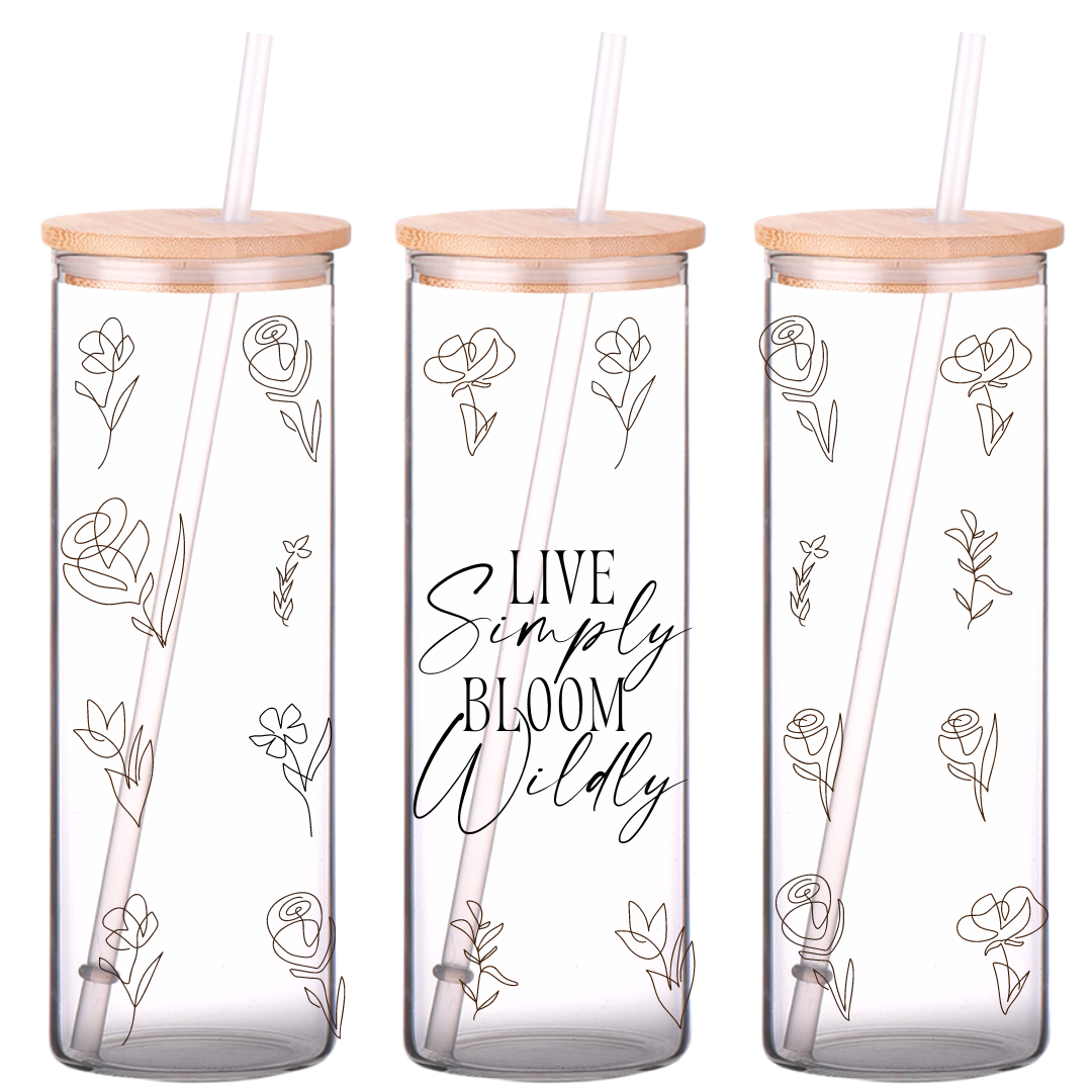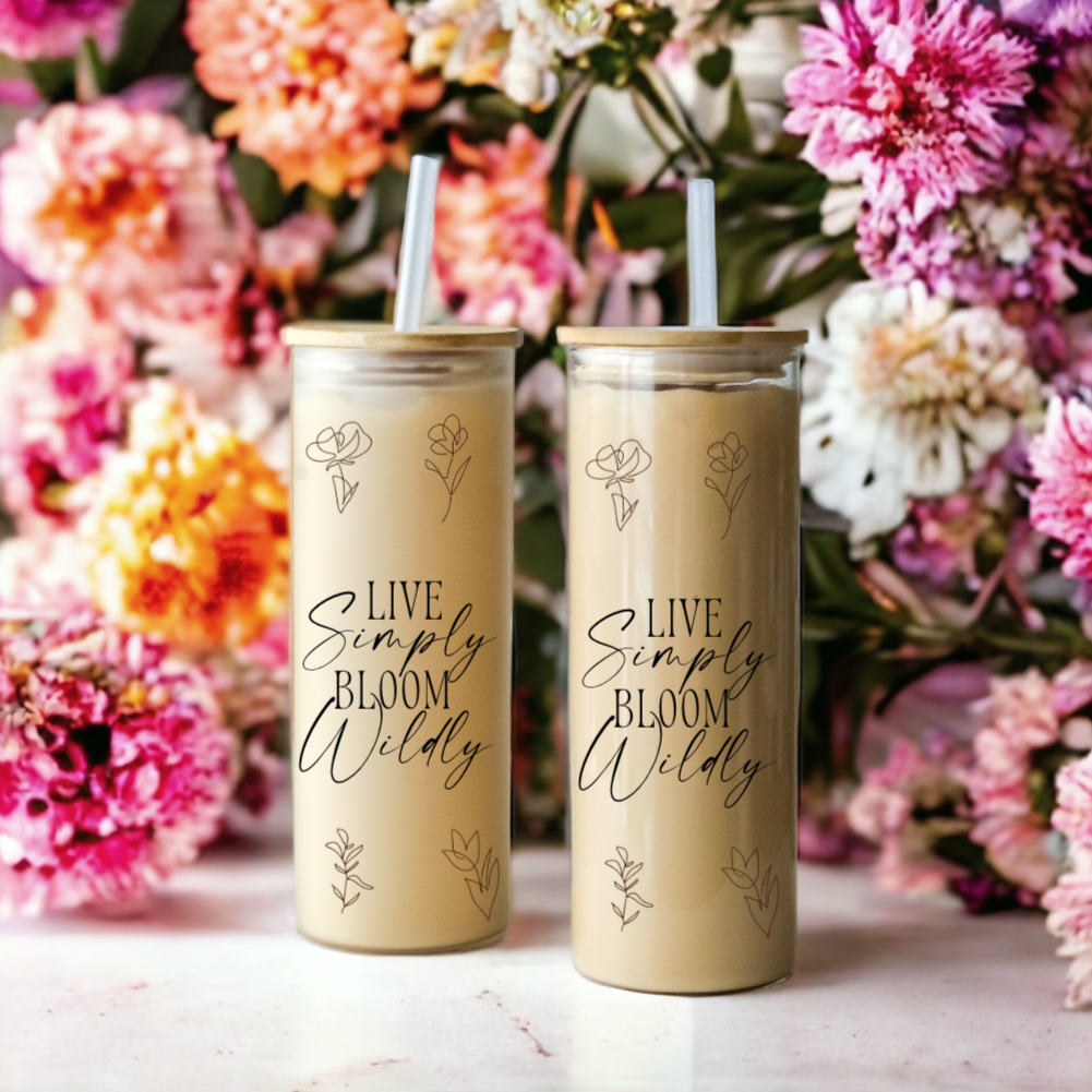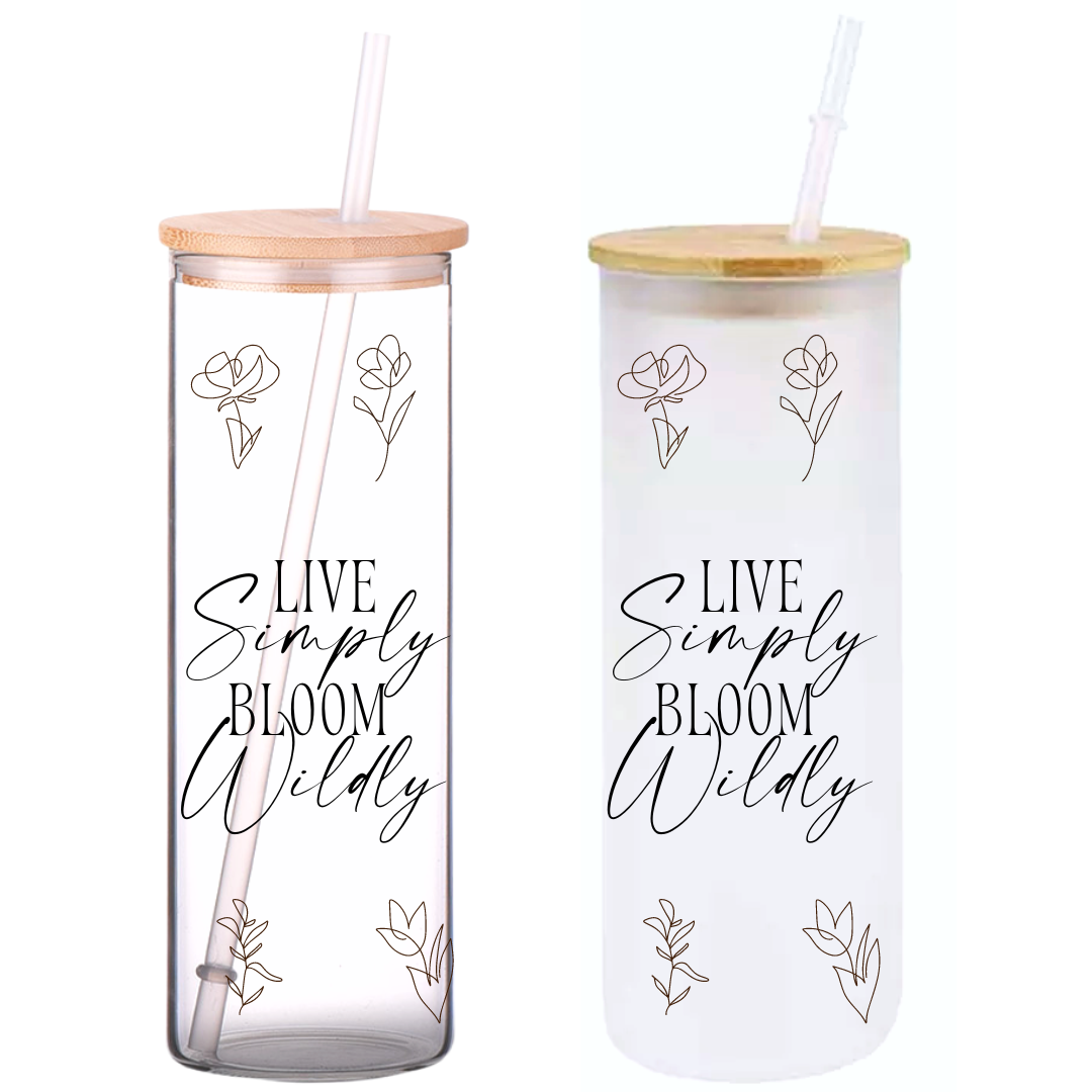 Sip on summertime vibes in style with this extra large 25oz glass tumbler! It features a "Live Simply Bloom Wildly" design, plus a bamboo lid and straw for easy sippin'. Perfect for those long days spent in the sun enjoying an iced coffee or other yummy beverage. Cheers!