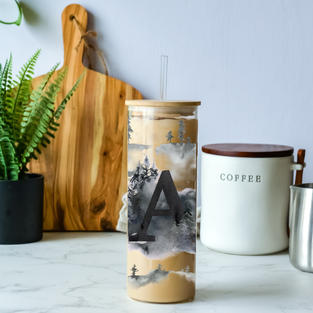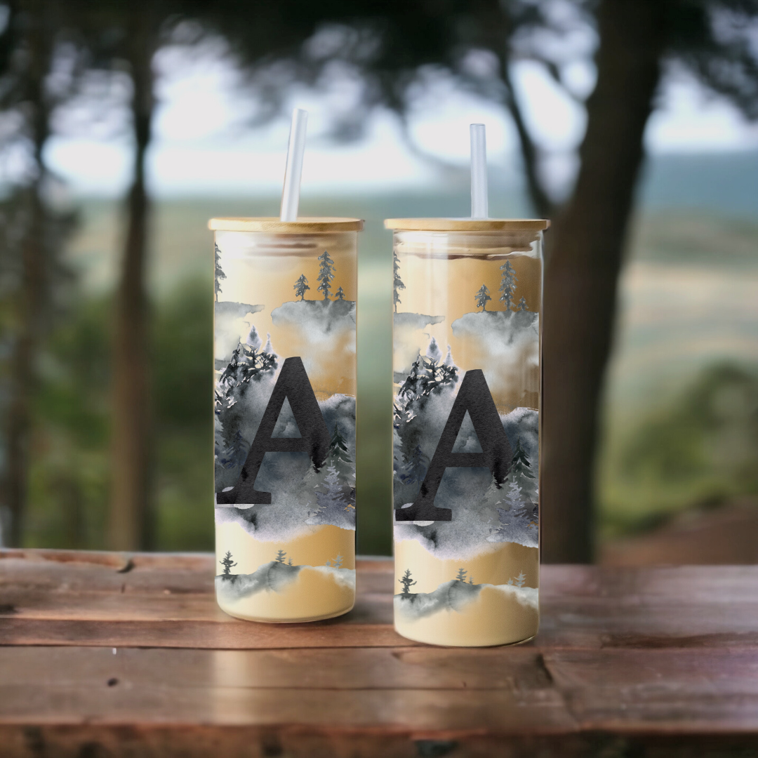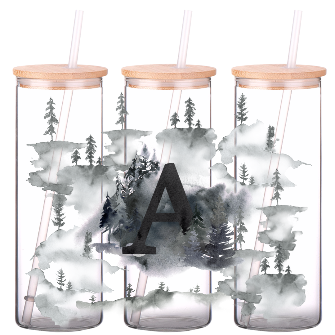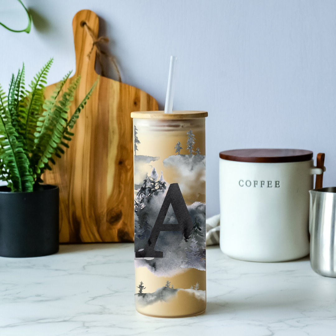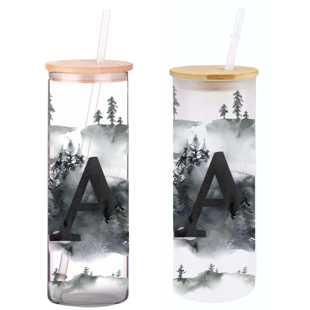 Enjoy your morning coffee, iced tea, or whatever beverage you choose with style! This Foggy Trees Initials 25oz glass tumbler is perfect for sipping and is environmentally friendly with its bamboo lid and straw! Perfect for making a statement with its iconic foggy trees design, you can express yourself while enjoying your favorite drink!