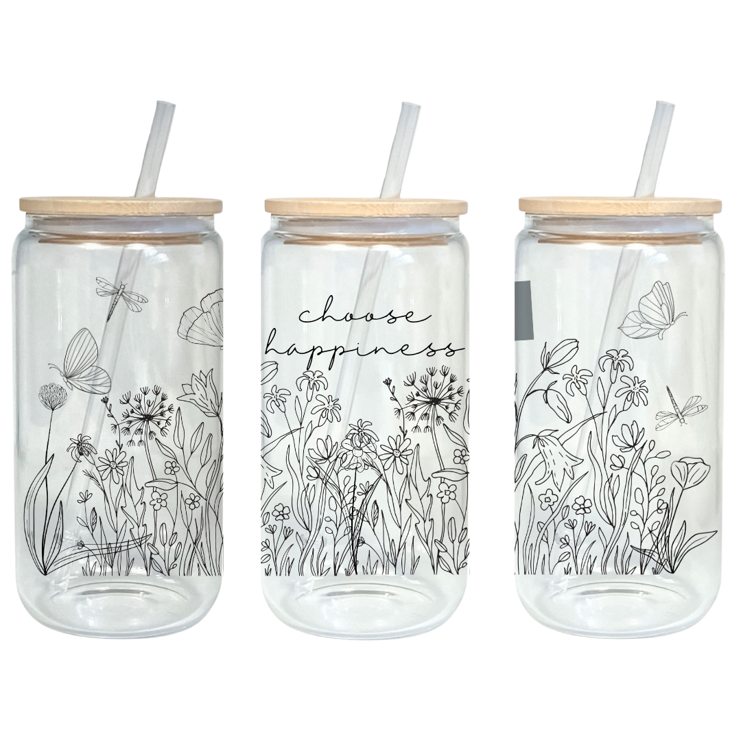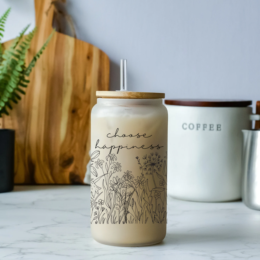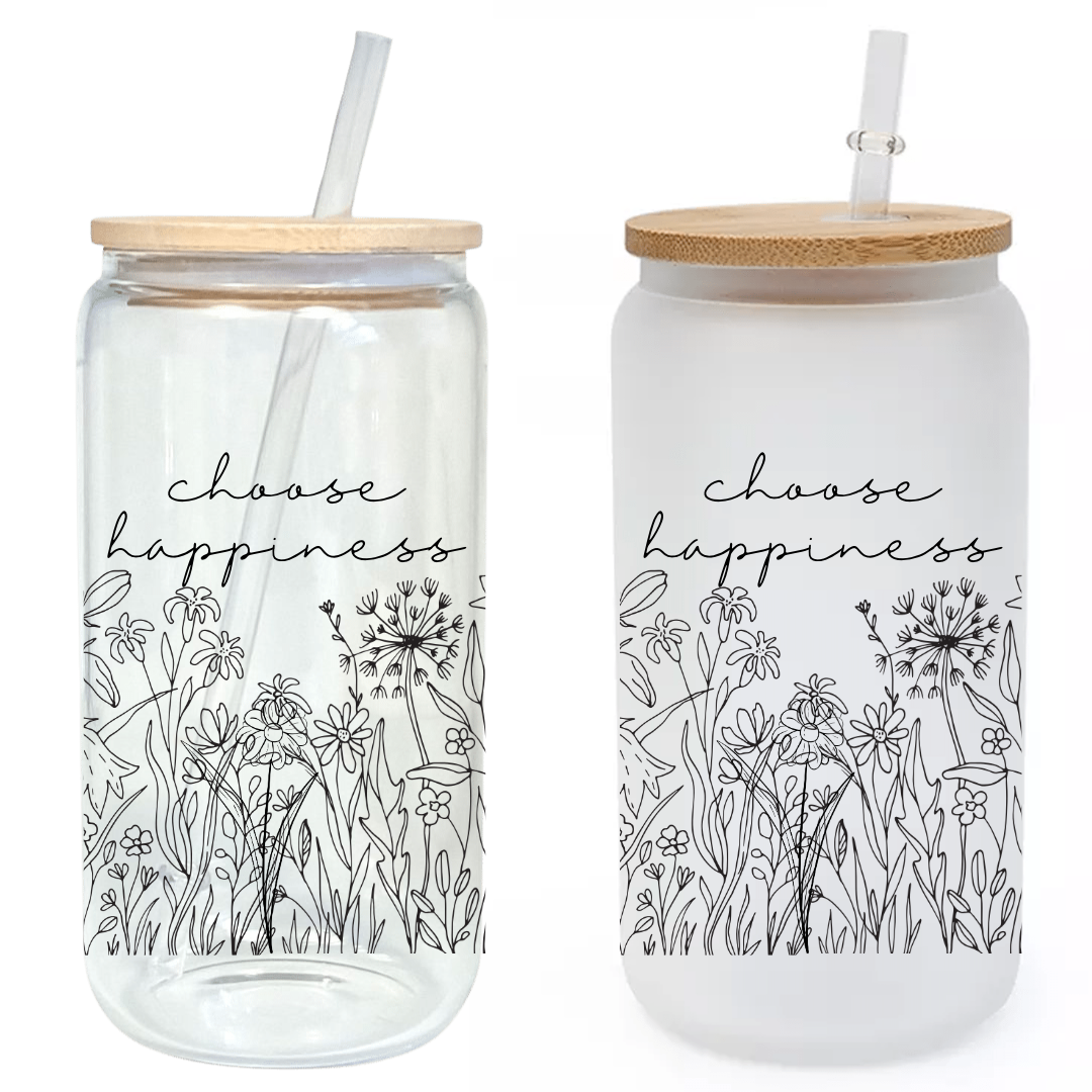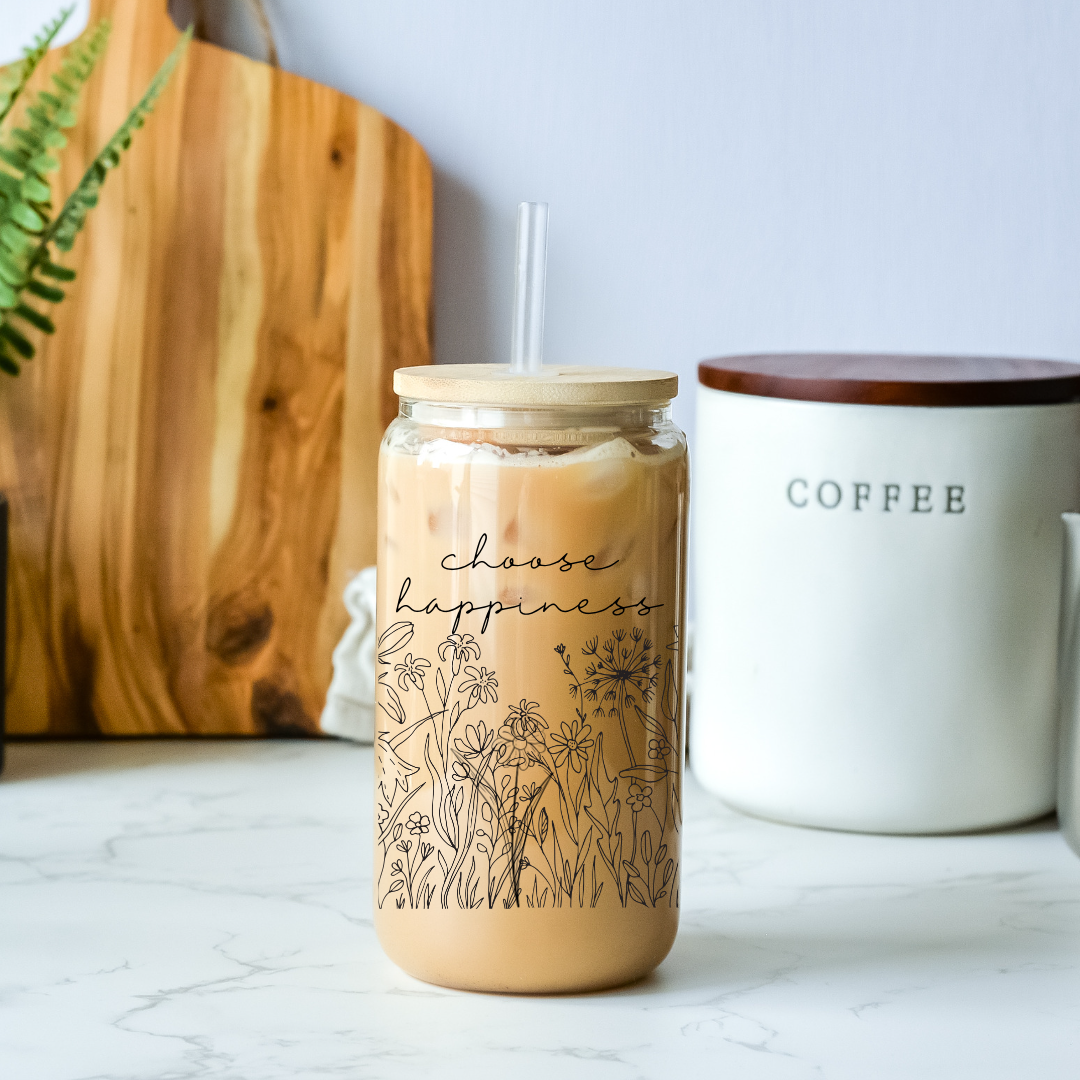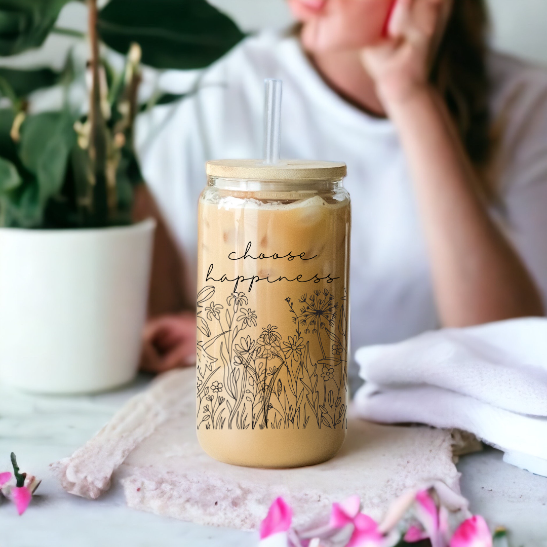 Choose Happiness Glass Tumbler with Bamboo Lid & Straw for Iced Coffee & Beverages