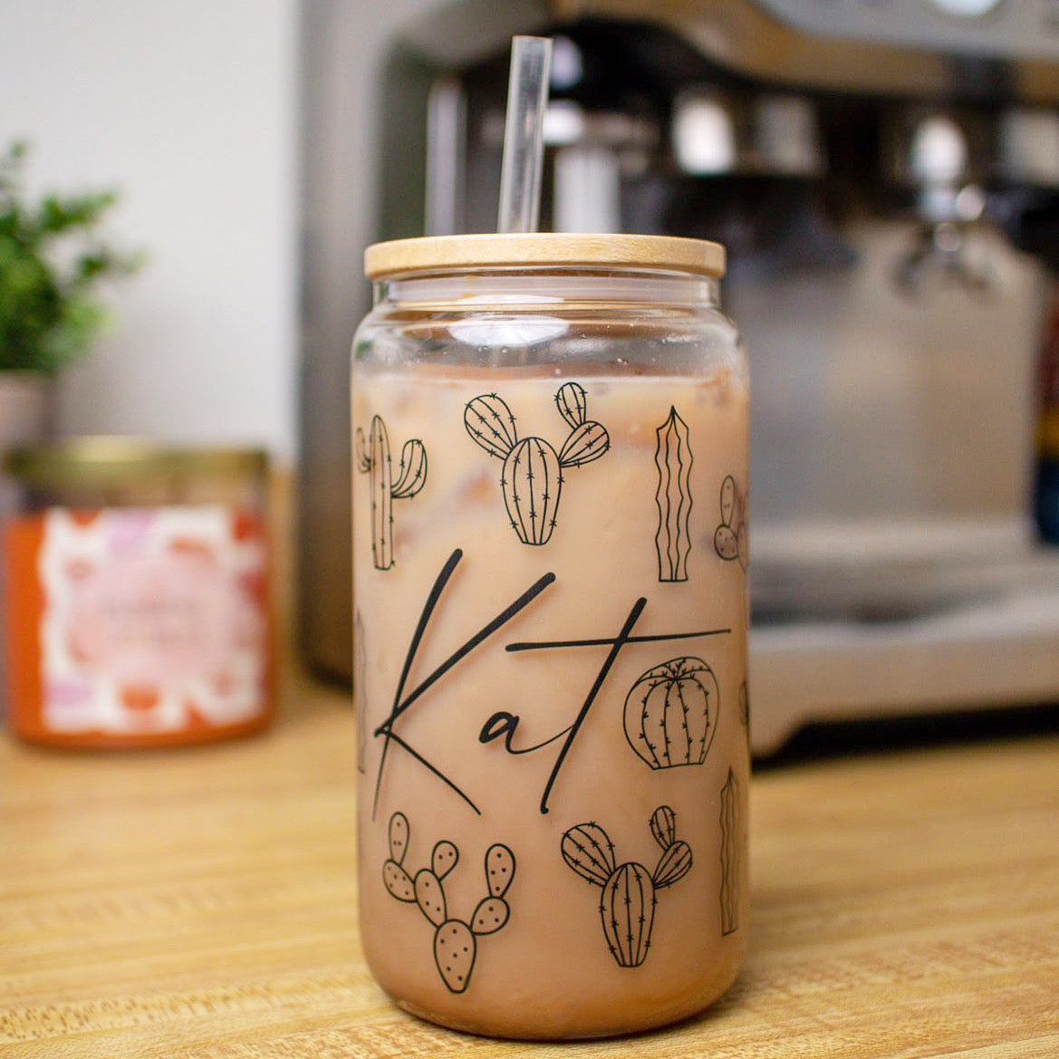 These are our cute, trendy, high quality and durable 16oz glass tumblers with a bamboo lid and plastic straw included.