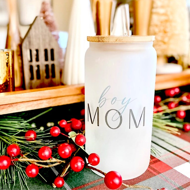 Boy Mom 16oz Glass Tumbler w/ Bamboo Lid & Straw