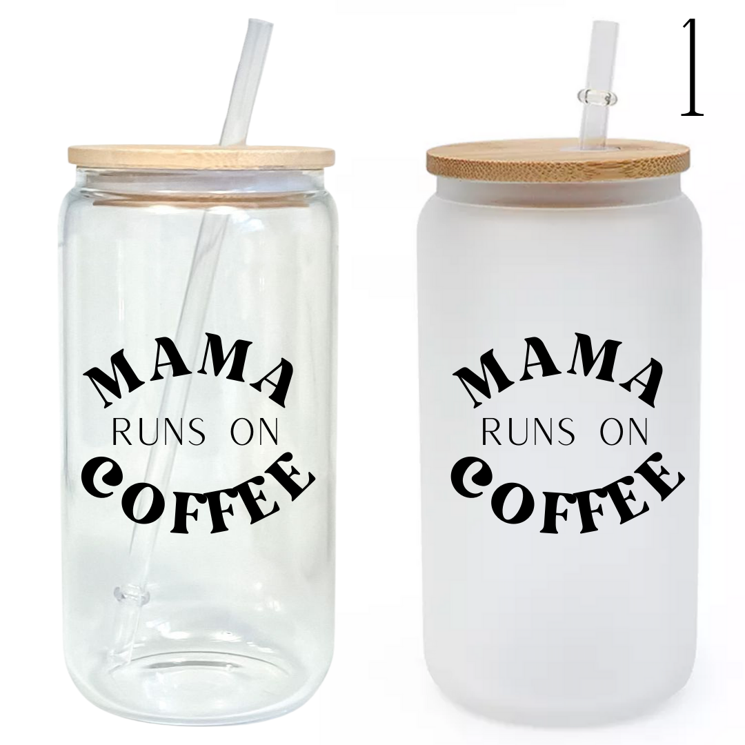 Mama Runs on Coffee Glass Tumbler with Bamboo Lid & Straw
